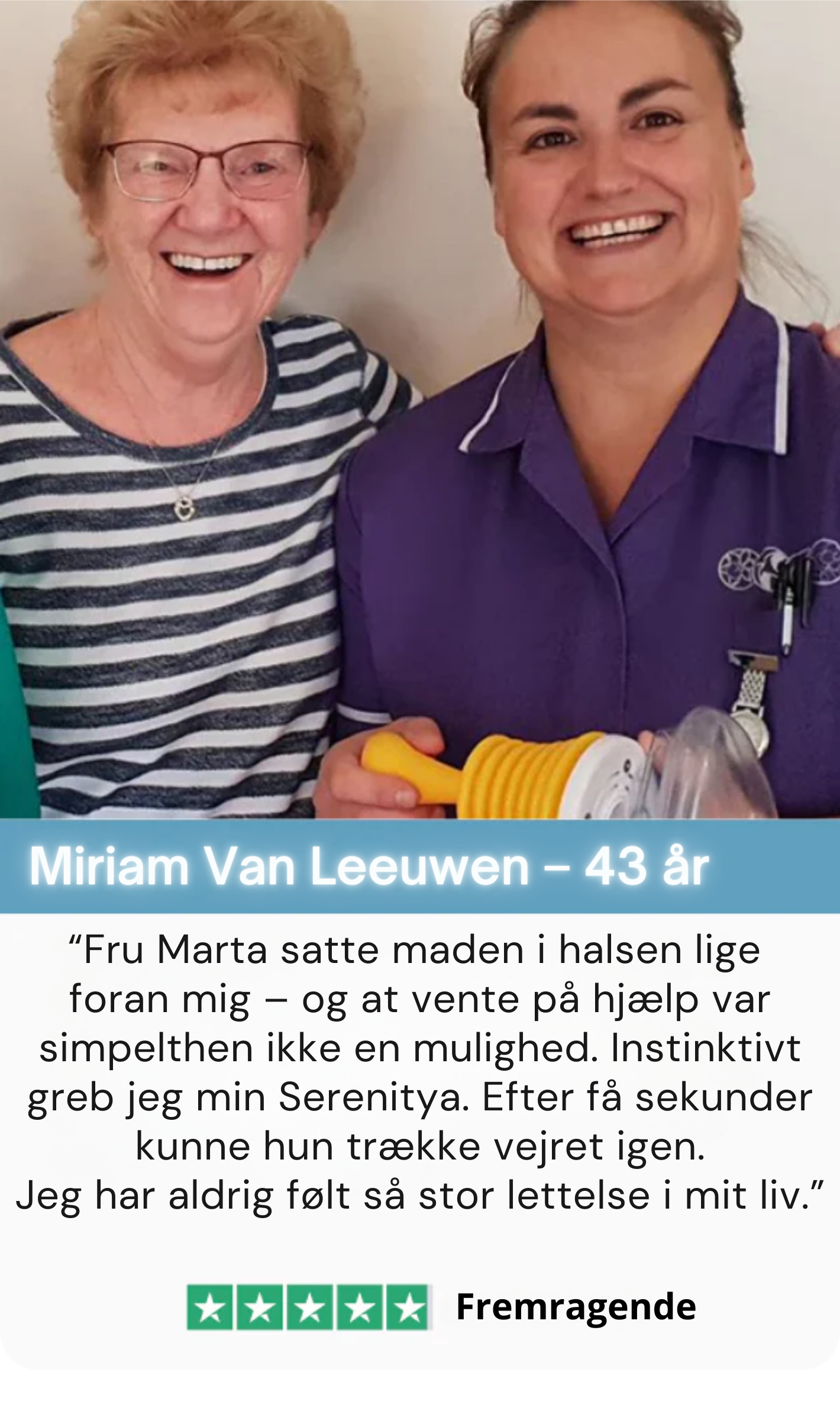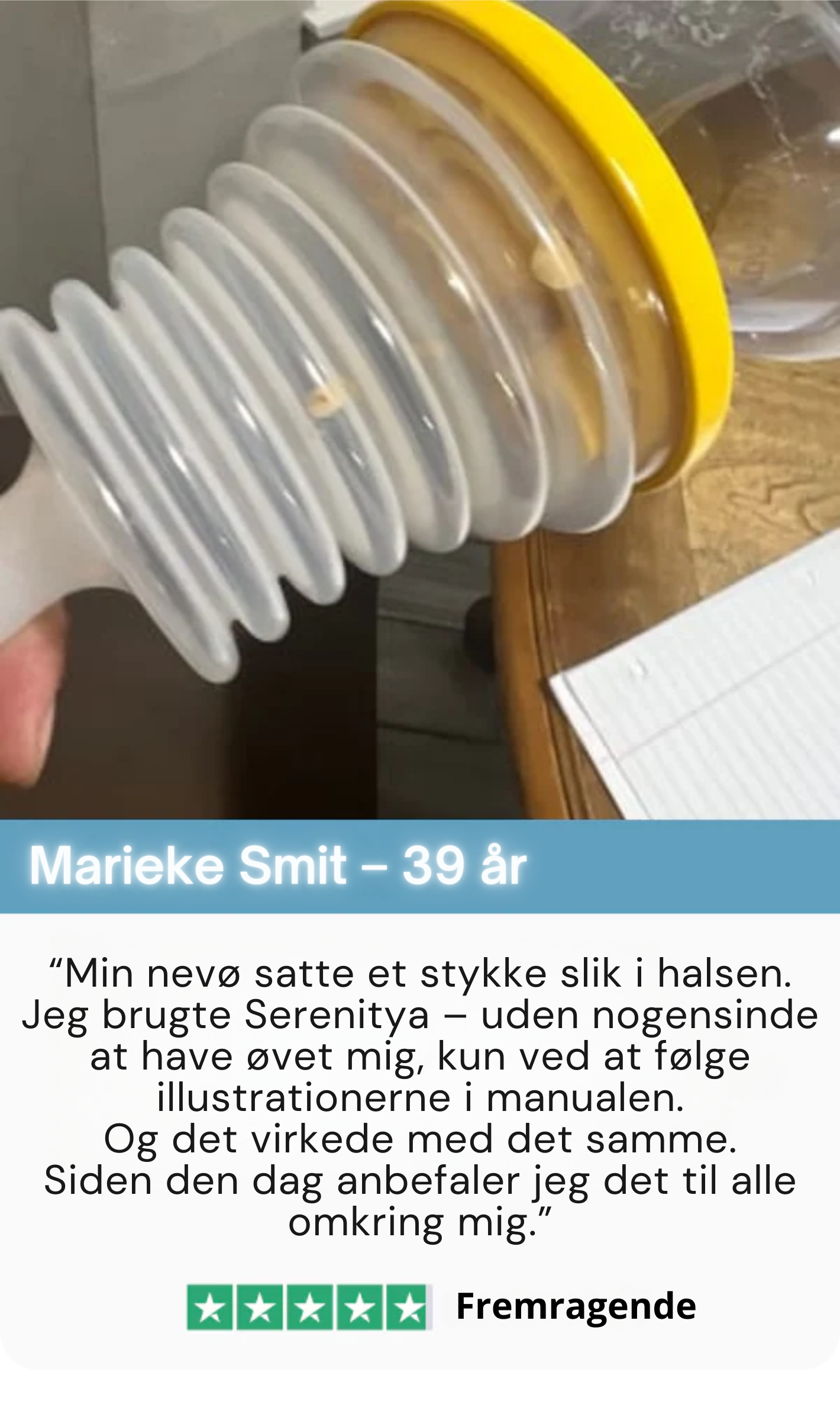 For et år siden var min nevø ved at blive kvalt i et stykke steak. Min søster anede ikke, hvad hun skulle gøre. Siden den dag har jeg været langt mere opmærksom på førstehjælp. Da jeg opdagede Serenitya, bestilte jeg det med det samme. Nu har jeg et sæt herhjemme – og jeg gav også et til mine forældre. Man håber selvfølgelig, at man aldrig får brug for det, men sådan et apparat kan gøre hele forskellen.
