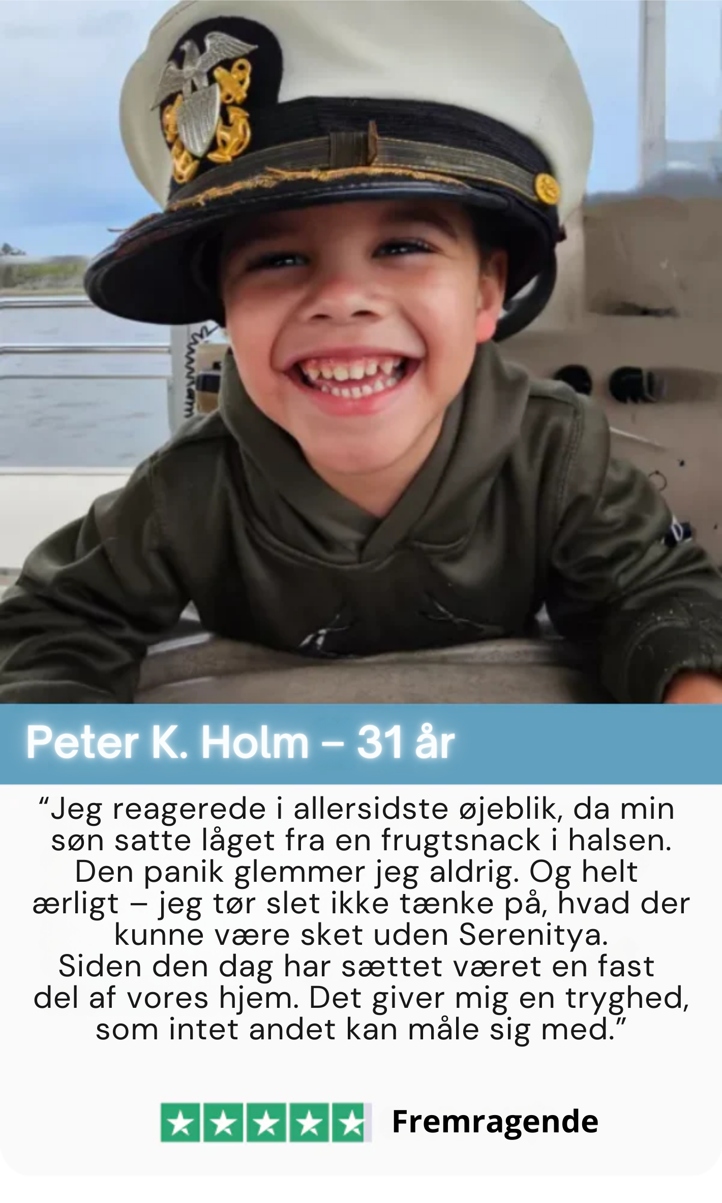 "Som akutlæge ser jeg dagligt, hvor hurtigt en kvælningssituation kan blive livstruende. Serenitya er et enkelt og brugervenligt redskab, der hjælper familier med at være bedre forberedt, når hvert sekund tæller. Det giver forældre og bedsteforældre et ekstra lag sikkerhed i de øjeblikke, hvor det virkelig gør en forskel."