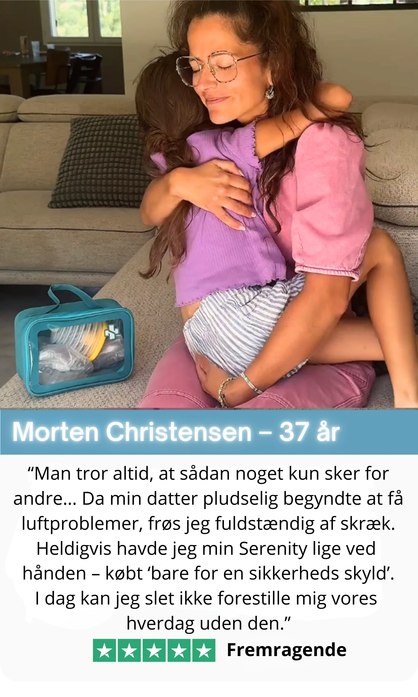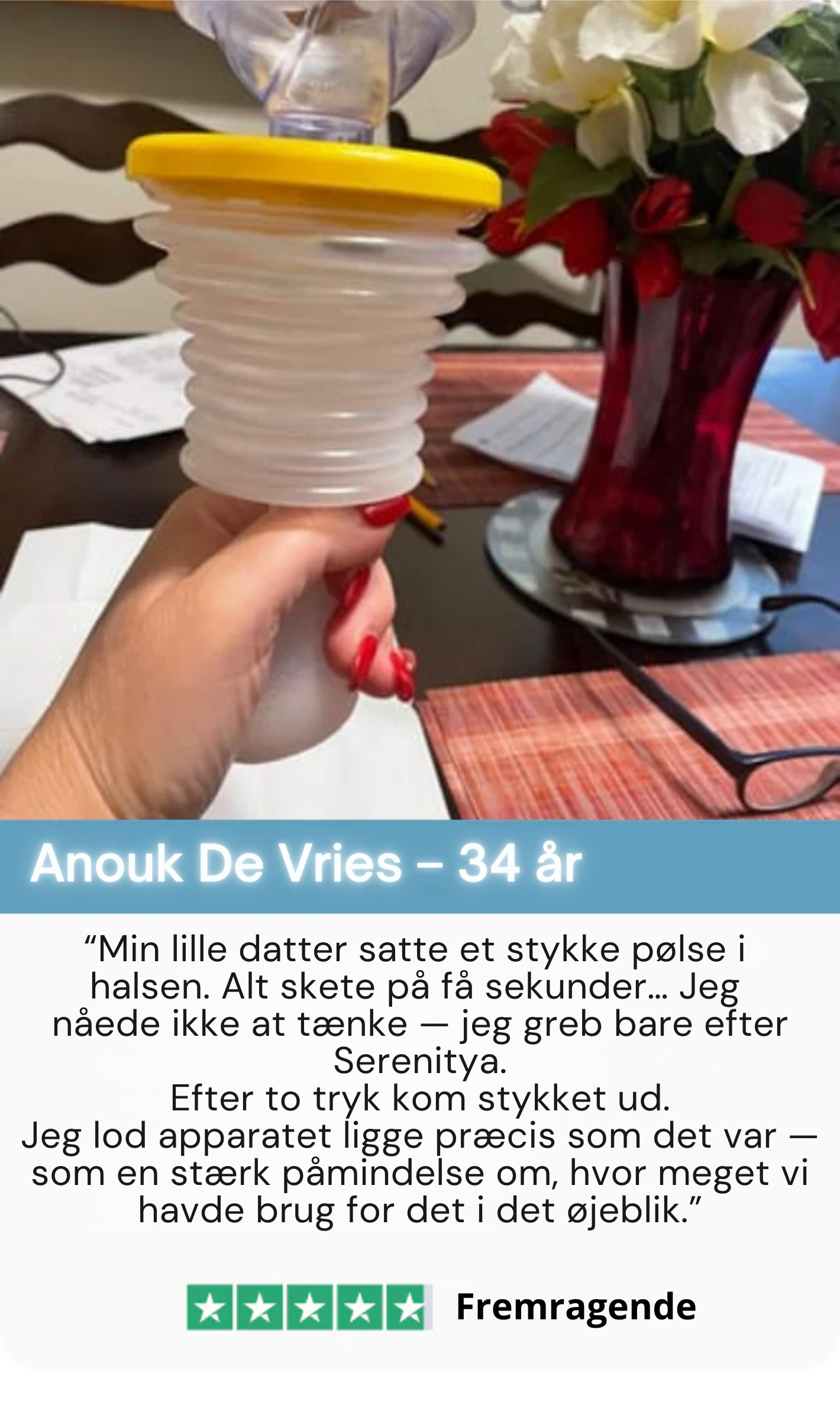 For et par uger siden var min søn ved at blive kvalt i et stykke slik. Heldigvis endte det godt, men siden den dag har jeg været bange for, at jeg ikke ville være forberedt, hvis det skete igen. Serenitya giver mig en helt anden tryghed nu. Det står fremme på hylden – klar til brug, hvis noget går galt. Jeg er virkelig taknemmelig for, at sådan et produkt findes.